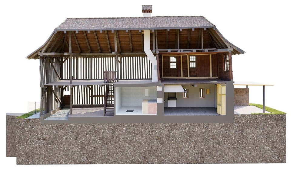 Gebäudeschnitt eines Hauses mit detaillierter Innenansicht, zeigt die Architektur und Raumaufteilung über zwei Etagen.